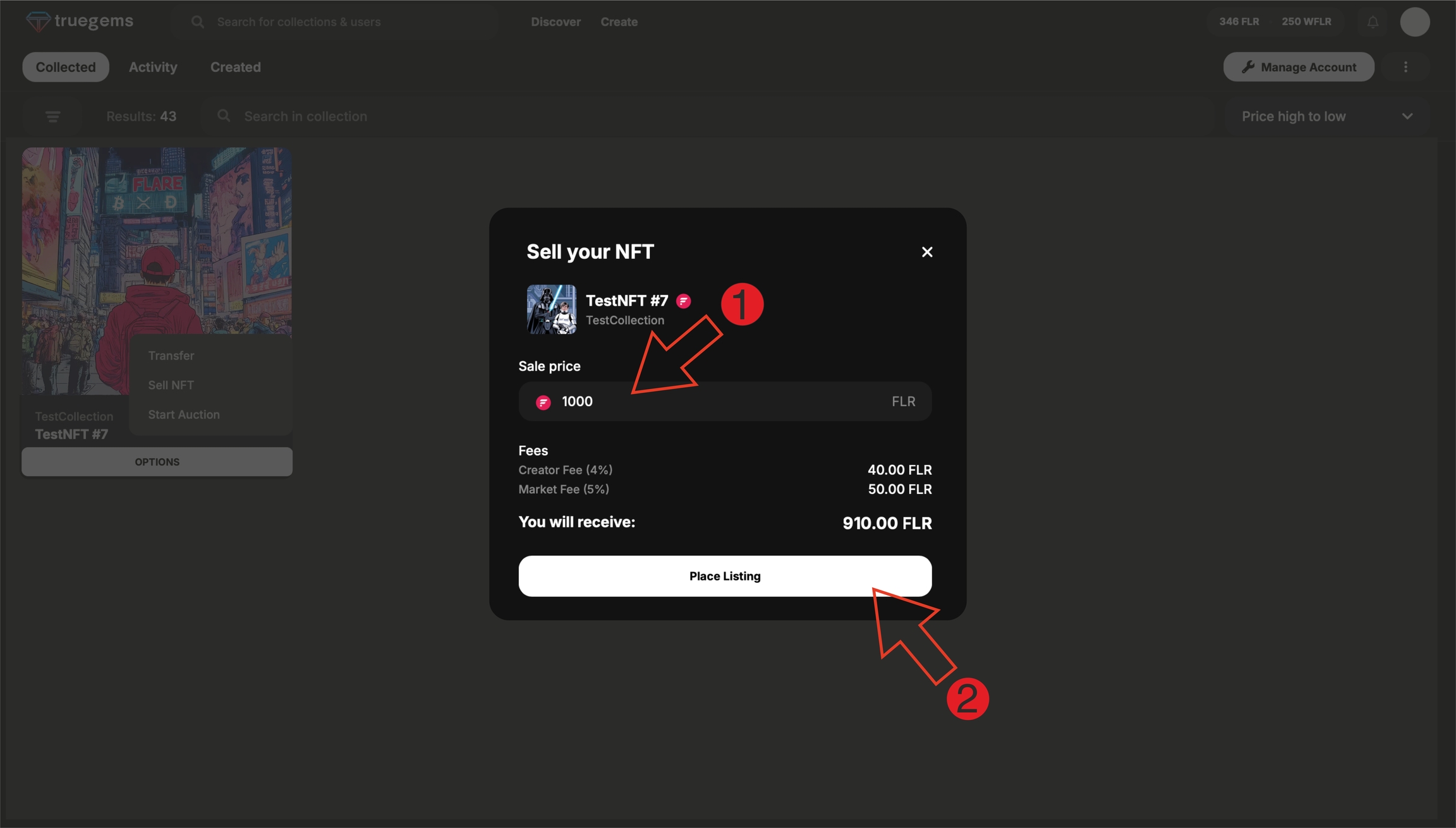 First, set your desired sell price. Once done, you should see the fees that will be charged in case of a successful sale. Total fees include the Creator fee (maximum 10%, set by the NFT creator) and the Market Fee (5%). When you're ready to list your NFT for sale, click "Place Listing." Ensure your wallet is ready to sign the transactions.